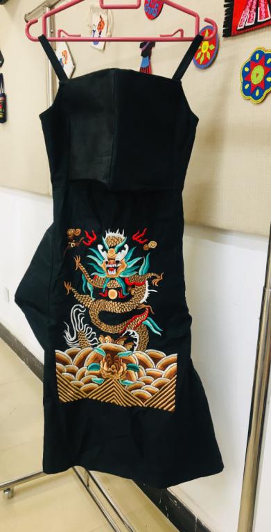 再如张丽丽作品《上邪》在创作设计中,提取了古戏服的刺绣图案及图案色彩,整套设计的大基调以黑色为主,面料方面运用质地较为厚重带有肌理的黑色亚麻,根据造型控制粘衬的软硬程度,运用极具现代主义和时尚感的廓形,将四平戏古戏服和几何元素碰撞创新,棱角的廓形与柔美的刺绣相结合,未来感与古风皆具。