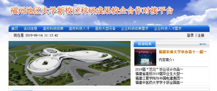 为认真落实福建省、福州市对创新发展工作的要求,充分发挥福州地区大学新校区科研人才与技术聚集的优势,促进高校科研成果优先在福州市转化应用,推动产学研用融合发展,福州地区大学新校区科研成果校企合作对接平台网站已于2018年上线运行。为进一步加大数据信息收集和发布力度,继续充实完善相关数据,请理工科单位组织相关教师于2019年6月21日(周五)前登录系统(网址:http://218.106.155.158:9401/xmdjpt/main/pagefront/view)在线填写,教师需填写“科技成果信息”和“科技人才信息”两个栏目。