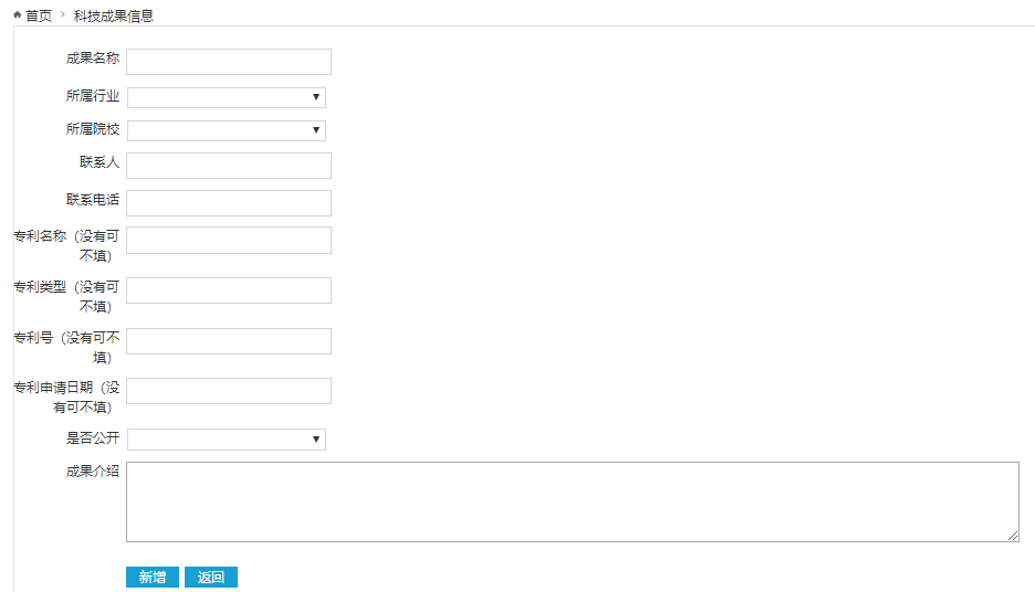 按表格各栏目要求进行内容填写,填好后点击“新增”。完成“科技成果信息”填报。