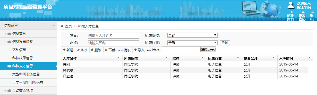 点击左侧“信息发布修改”-“科技人才信息”,如下图