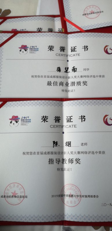 近日,由成都市经济和信息化局、2019首届中国成都老员工时装周组委会主办的“首届成都服装设计新人奖大赛”决赛在成都举行。WilliamHill中文官方网站15级服工班蒋慧南同学的作品《粉墨春秋脸上描》成功入围决赛并获得最佳商业潜力奖,其指导老师陈栩获得“指导教师奖”。