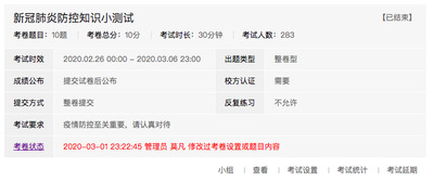 为普及新型冠状病毒肺炎防护知识,提高员工自我防范意识和保护能力,2月26-3月6日,服装公司举办新型冠状病毒肺炎疫情防控知识竞赛活动,共283名员工参加。