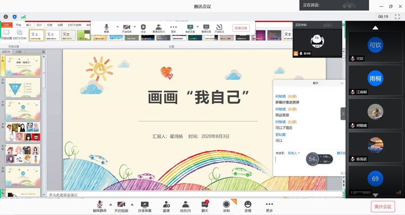 在精心制作教学课件的基础上,实践队员们利用QQ群课堂直播平台为孩子们进行线上授课。在以“画画我自己”为主题的课程中,队员们通过分享一系列自画像,引导孩子们从自身出发,对发型、脸型、五官等进行观察,一步步带领孩子们绘制自己的画像,并对孩子们的作品进行一对一辅导和耐心点评。