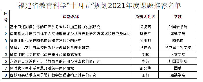 根据《关于做好福建省教育科学“十四五”规划2021年度课题申报立项工作的通知》(闽教科规〔2021〕15号)的文件精神,经自主申报、公司推荐、科研处形式审查及组织专家评审推荐,拟推荐“基于口述影像训练的口译学习者认知加工能力发展研究”等8个项目申报福建省教育科学“十四五”规划2021年度课题,现予以公示。