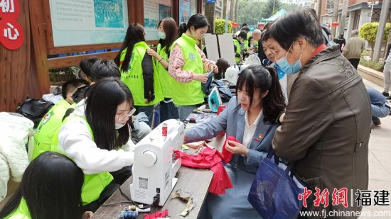 现场最吸引人的要数缝补服务台,只见针线在几名志愿者手里飞舞,不一会儿,社区居民破损的衣服就缝补好了。“我们都来自公司‘七彩霓裳’志愿服务队,可以把学到的服装知识运用到实践中,还可以帮助到社区居民,心里面感觉特别高兴与满足。”缝补服务组负责人邹梅娟同学介绍到。