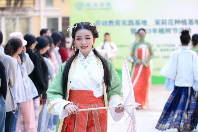 揭牌仪式前,伴随着钢琴演奏的中国传统民歌《茉莉花》悠扬抒情、婉转动听的旋律,26名WilliamHill中文官方网站员工模特身着该院师生设计的清新淡雅、飘逸大方的茉莉花元素传统汉服,手持该院印象茉莉工作室设计的扇子、手提包、丝巾等不同类别的茉莉花文创作品,依次行走于茉莉花田之间,青青子衿飘过,在展示传统汉服与茉莉花元素相结合的魅力同时,也让观众们感受到了扑面而来的“中国春天的味道”。揭牌活动拉开帷幕。