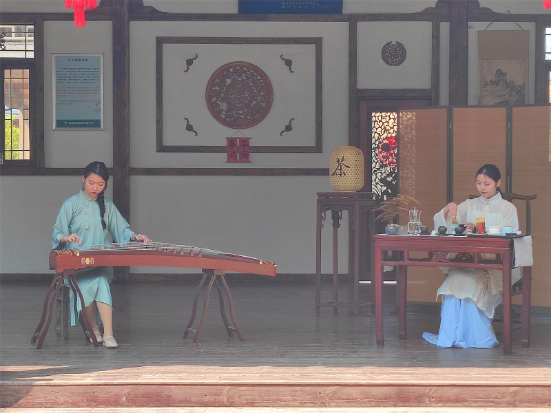 在茶歌演艺区,典雅柔和的古筝曲在凉亭中响起,志愿者弹奏的古筝优美动听,吸引着不少往来游客的驻足。