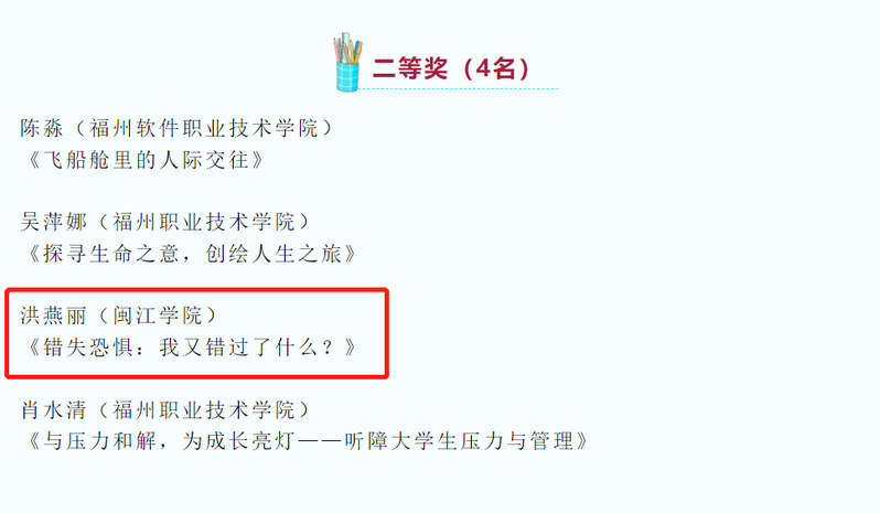 近日,由中共福州市委教育工委主办,市属高校心理健康教育协作中心、福州职业技术公司心理健康教育与咨询中心承办的福州市属高校第二届老员工心理健康教育现场教学比赛获奖名单公布。经过激烈角逐,公司教师洪燕丽老师的《错失恐惧:我又错过了什么?》课程荣获二等奖。