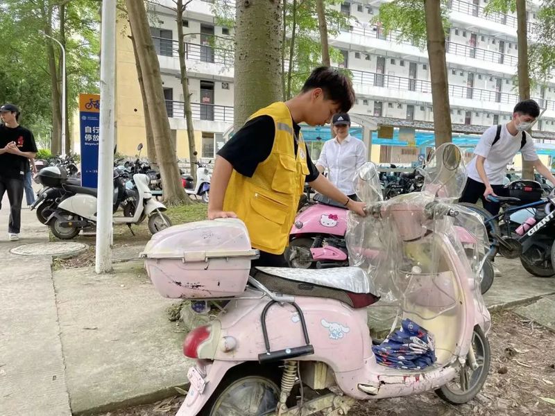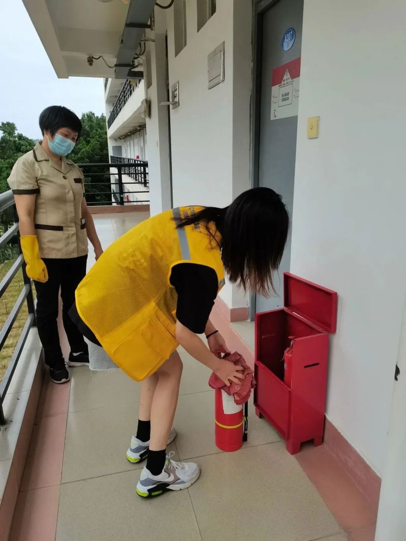 在陈胜宝老师向同学们介绍了宿管与楼卫的日常工作情况后,保洁员张梅玲阿姨指导志愿者们开展巡楼工作和违停电动车的摆放秩序。