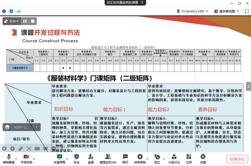 赵莉老师以其负责的福建省一流线下课程《服装材料学》为例,讲授了课程开发的基本原理、方法与评价,课程开发实操的方法等,强调“四真三化(FT)”课程建设模式的重要性,并对每级对应实现的教育目标做了深入浅出的阐述。