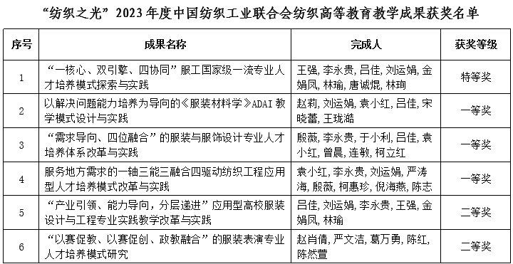 其中,王强等申报的《“一核心、双引擎、四协同”服工国家级一流专业人才培养模式探索与实践》荣获特等奖;赵莉等申报的《以解决问题能力培养为导向的<服装材料学>ADAI教学模式设计与实践》、殷薇等申报的《“需求导向、四位融合”的服装与服饰设计专业人才培养体系改革与实践》、袁小红等申报的《服务地方需求的一轴三能三融合四驱动纺织工程应用型人才培养模式改革与实践》荣获一等奖;吕佳等申报的《“产业引领、能力导向,分层递进”应用型高校服装设计与工程专业实践教学改革与实践》、赵肖倩等申报的《“以赛促教、以赛促创、政教融合”的服装表演专业人才培养模式研究》荣获二等奖。