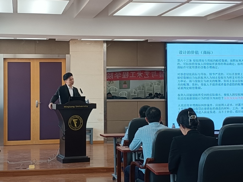 杨总经理从“知识产权与创新创造是重大国策”、“设计的前景与价值”、“设计侵权怎么认定”、“协同创新项目架构”、“知识产权创新思路体系在福建的落地实践”、“‘高校’高质量高价值专利形成与产业转化”等几个方面讲授了知识产权的重要性、申请专利的基本知识与价值、如何维护自己的知识产权、知识产权在福建的产业转化等。杨总经理通过大量数据表明,近年来全国专利密集型产业增加值占 GDP比重的占比,阐述了专利的价值。另一方面,结合我国的法律法规说明了侵犯商标专用权和侵犯专利权的相关处罚规定,重点讲述了设计的价值。