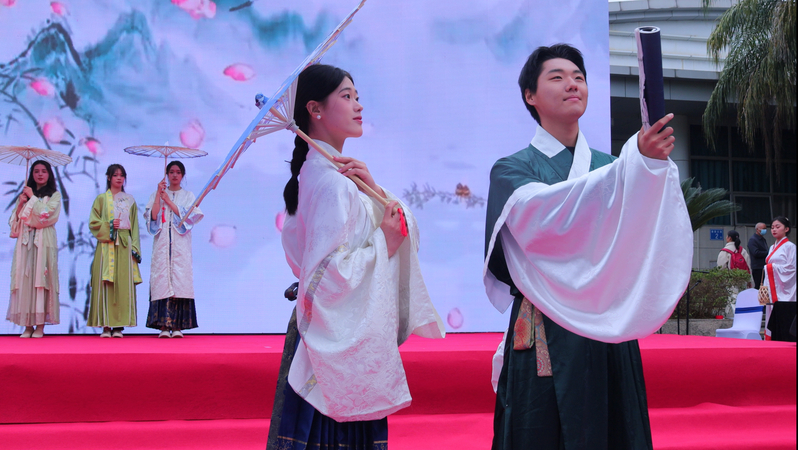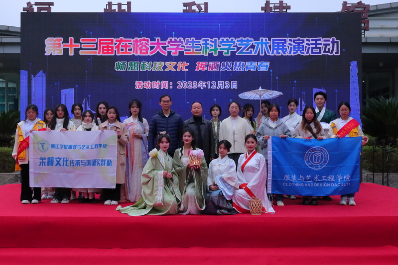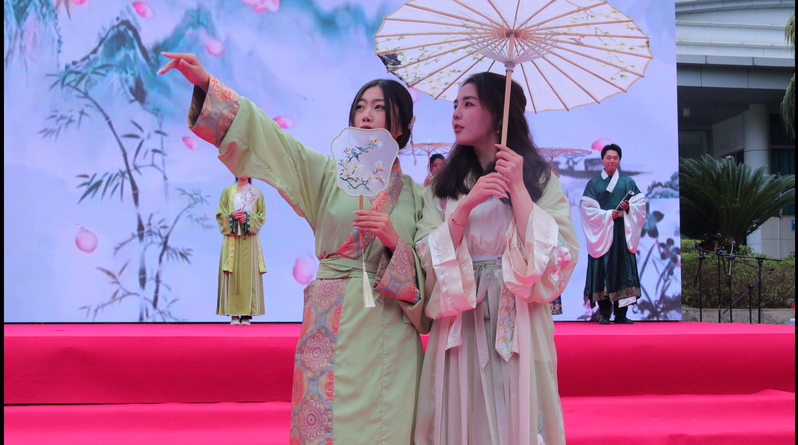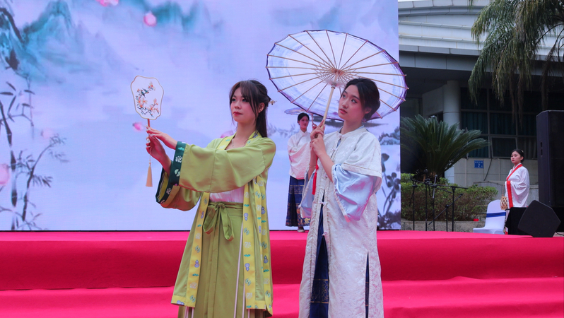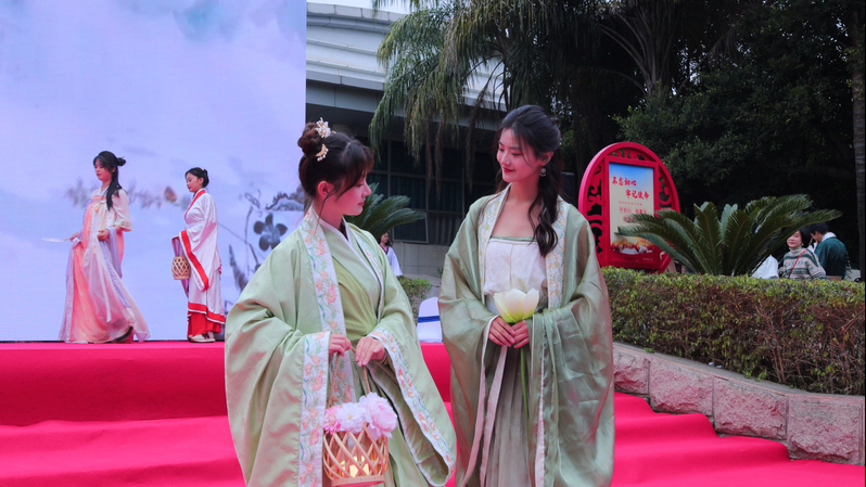 服章之美谓之华。在科技馆正门舞台上,伴随悠扬抒情的旋律,12名员工模特身着公司师生原创系列汉服,手持扇子、油纸伞等文创作品款款走来,以其别具一格的艺术表现力向福州市民展示了传统汉服与茉莉花元素相结合的独特文化魅力,亮相的瞬间就抓住了活动现场嘉宾和数百名观众的眼球。