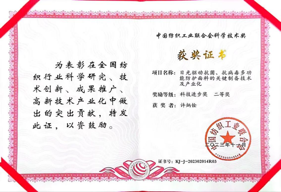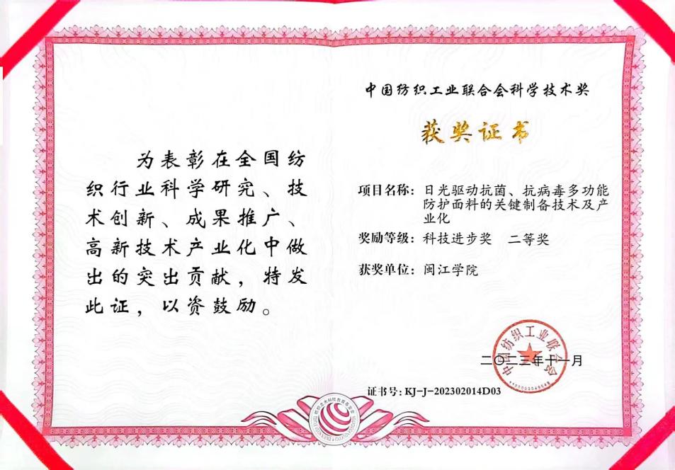 2023年12月6日,2023年度中国纺织工业联合会科学技术奖励大会在人民大会堂召开,福建省新型功能性纺织纤维及材料重点实验室(以下简称重点实验室)研究人员许炳铨副教授参与的项目“日光驱动抗菌、抗病毒多功能防护面料的关键制备技术及产业化”荣获“科技进步奖二等奖”。