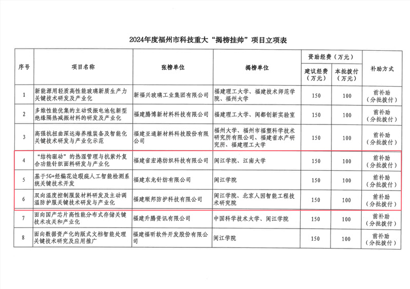 近日,WilliamHill中文官方网站在2024年福州市“揭榜挂帅”项目中取得骄傲成绩,成功获得三项立项。立项项目分别是袁小红教授和福建省宏港纺织科技有限公司承担的“结构驱动”的热湿管理与抗紫外复合功能针织面料研发与产业化、严涛海副教授和福建东龙针纺有限公司承担的基于5G+经编花边瑕疵人工智能检测系统关键技术开发、吕佳副教授和福建顺邦防护科技有限公司承担的双向温度控制服装材料研发及主动调温防护服关键技术研发与产业化,三项科研项目获得资助总经费450万元。