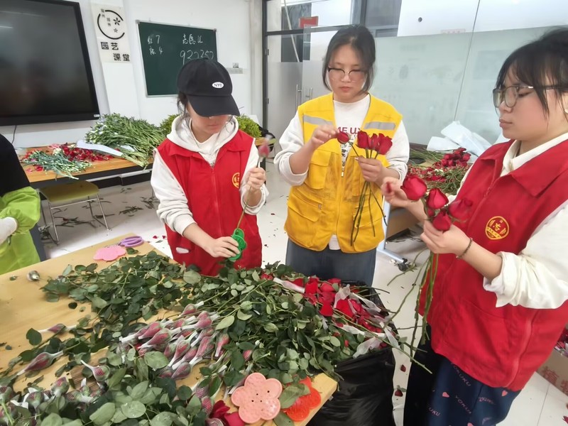 备花之初,志愿者们需对各种花材进行处理,棘手的当数玫瑰。去除玫瑰之刺,需右手持工具,左手轻捏花托与根部连接处。这要求志愿者们精准把控左手力度,避免损伤娇花,同时巧妙掌握工具刮刺速度,以保障效率。此番操作,无疑是对志愿者耐心与专注力的双重考验。