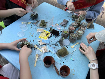 盆栽制作活动也在茉莉花劳动教育基地如火如荼地进行。同学们精心挑选心仪的绿植,搭配创意装饰,制作出一份份多肉盆栽和生态瓶,这些绿植被摆放到了工科楼C座的各个角落,为校园环境增添了一抹清新的绿意,也让更多师生感受到自然的美好。
