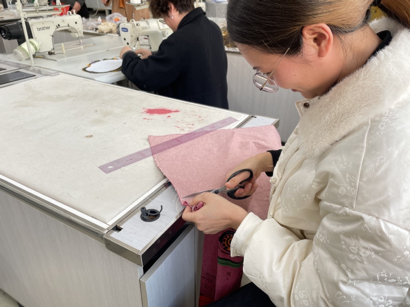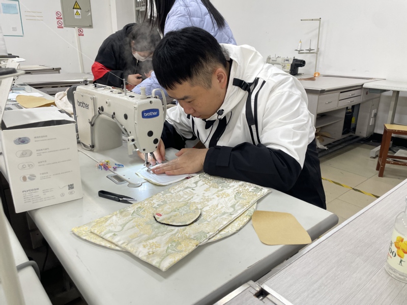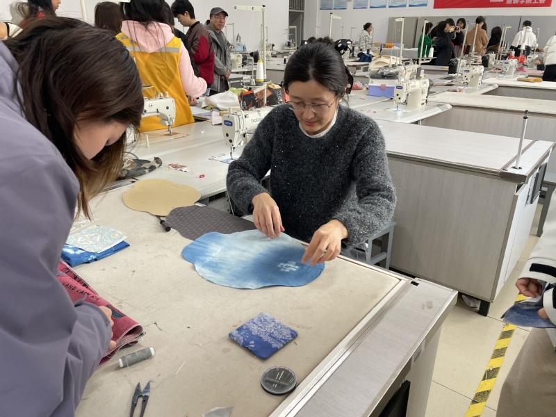 活动现场化身为流动的创意工坊,老师们将拼布等专业技艺融入茶席、茶杯垫、杯套制作,碰撞出摩登火花,碎布头在指尖蝶变为艺术品,缝纫机的哒哒声与欢笑声交织成独特的劳动乐章。活动现场穿梭着“小服星”志愿者们,他们不仅是时尚小助手——分享配色秘籍,更是贴心小管家,为专注创作的老师及时递上各类工具。“这款茶垫我要配我新买的茶杯”“你选的布块很搭”,活动现场洋溢着温馨的分享氛围,这一件件手工作品,就像看得见的纽带,把专业精神、师生情谊和工会关怀都连在了一起。