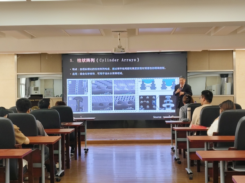 接着,蔡宜寿教授分享了超双疏表面加工领域的最新研究进展,他介绍了国内外科研团队在提高超双疏表面性能、降低生产成本、拓展应用范围等方面取得的突破和成果,同时也指出了当前研究中面临的挑战和问题。他鼓励师生们积极投身科研工作,勇于探索创新,为解决行业关键问题贡献自己的智慧和力量。
