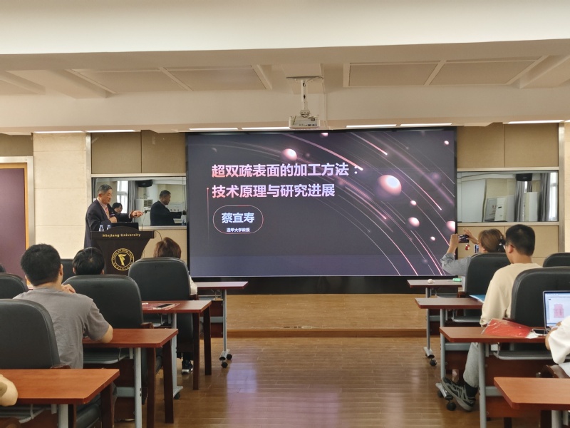 接着,蔡宜寿教授分享了超双疏表面加工领域的最新研究进展,他介绍了国内外科研团队在提高超双疏表面性能、降低生产成本、拓展应用范围等方面取得的突破和成果,同时也指出了当前研究中面临的挑战和问题。他鼓励师生们积极投身科研工作,勇于探索创新,为解决行业关键问题贡献自己的智慧和力量。