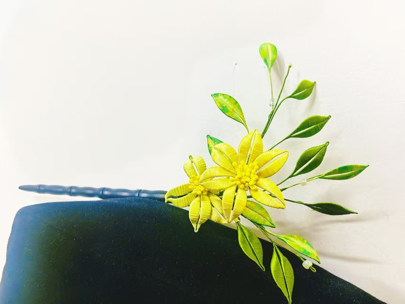 此缠花发簪以铃兰花为原型,取金黄、嫩绿蚕丝线,搭配珍珠增添温润质感。色彩明丽且富有层次感,既传承传统缠花技艺的精巧,又以简洁造型适配现代审美,簪身线条流畅,尽显古典雅致韵味,为发间添一抹灵动的东方诗意 。