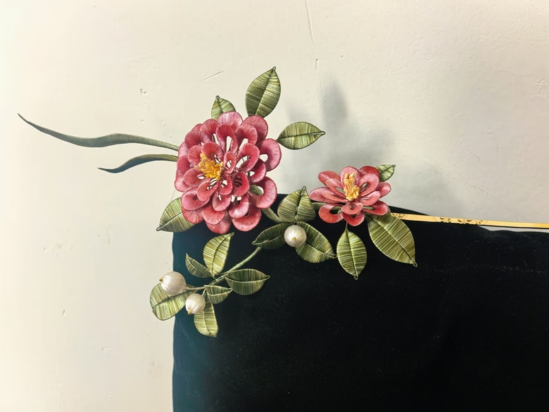 此缠花发簪以牡丹花为原型,花朵颜色采用较为复古的红色,叶片上是绿色双色线的交织,整体是经典的红绿搭配,营造典雅复古且有活力的视觉效果。