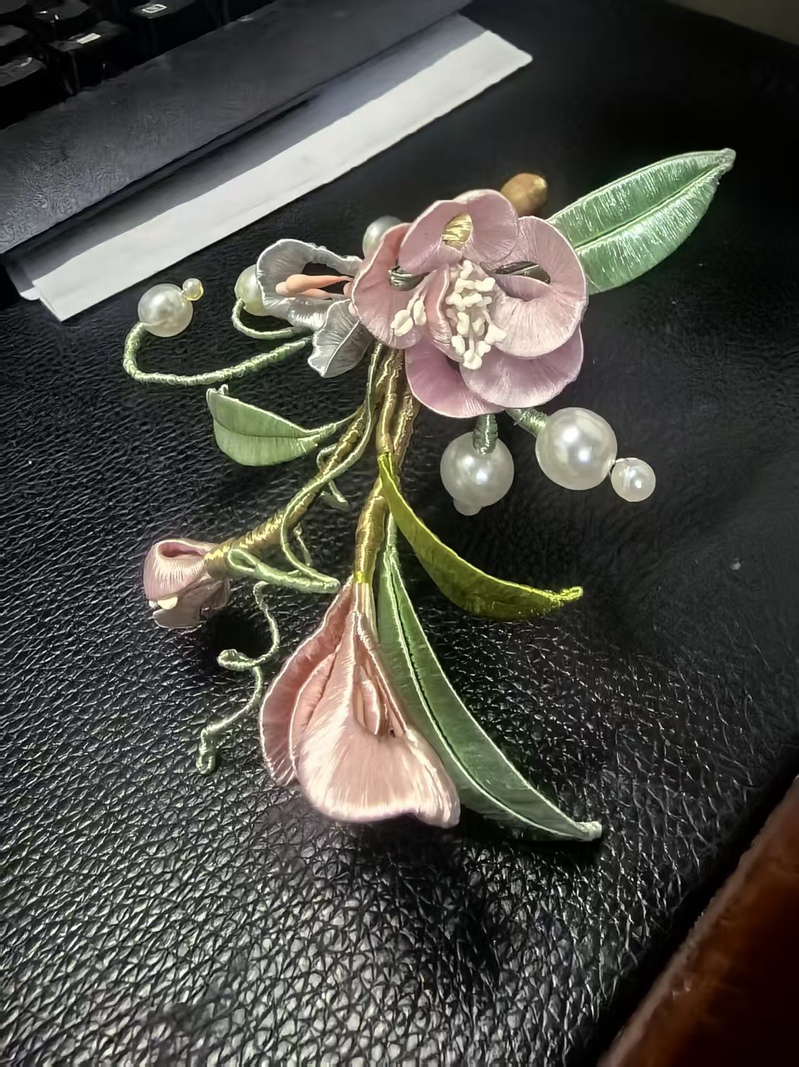 采用传统缠花工艺,以蚕丝线细腻缠绕铜丝骨架,塑造花瓣的轻盈与层次感。玉兰花以粉白渐变蚕丝呈现,模拟花瓣初绽的温润;禽鸟以白色丝线制作,后期上色,还原灵动姿态。辅以黄铜发簪为底,兼具古典韵味与实用功能。
