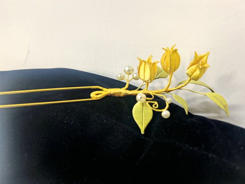 此缠花发簪以铃兰花为原型,取金黄、嫩绿蚕丝线,搭配珍珠增添温润质感。色彩明丽且富有层次感,既传承传统缠花技艺的精巧,又以简洁造型适配现代审美,簪身线条流畅,尽显古典雅致韵味,为发间添一抹灵动的东方诗意 。