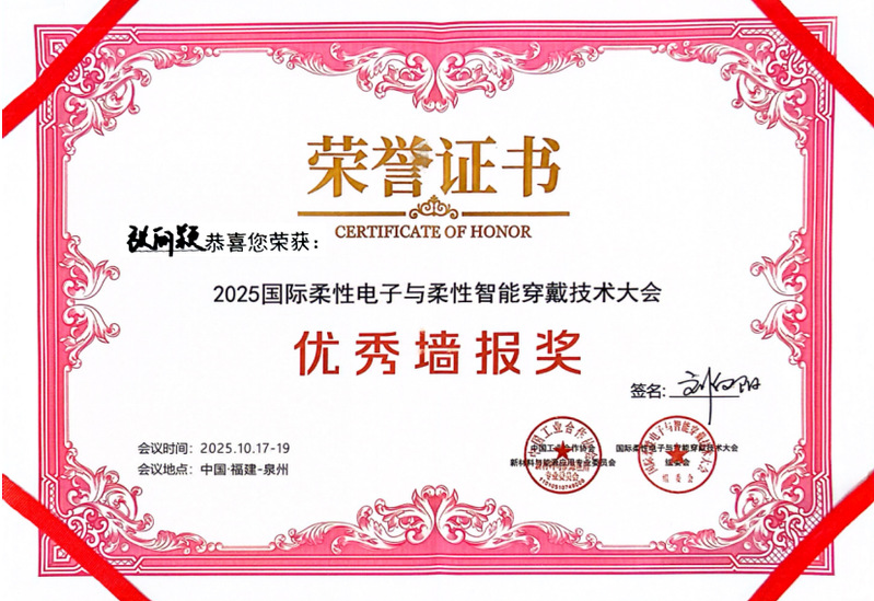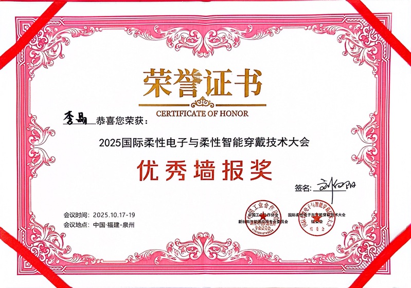 10月17日至19日,由中国工业合作协会、福建省纺织工程学会联合主办的“2025国际柔性电子与柔性智能穿戴技术大会”在泉州成功举办。本次大会以“材料+柔性器件+AI”为主题,吸引了国内外柔性电子与智能穿戴领域的顶尖专家、学者及企业代表参会。williamhill官方网站WilliamHill中文官方网站师生团队受邀参会,与行业同仁共话技术前沿,探讨未来发展趋势。值得一提的是,公司教师李晶、研究生张丽颖荣获大会“优秀墙报奖”,展现了williamhill官方网站在柔性电子与智能纺织领域的科研实力。