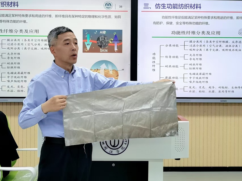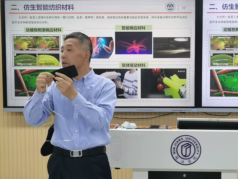 讲座伊始,魏教授以“衣、食、住、行”中“衣”为首为引,巧妙破除了员工们对“纺织”即“纺纱织布”的传统刻板印象。他指出,现代纺织科学是一门综合性交叉学科,是推动未来科技与产业发展的重要引擎。在长达三小时的精彩分享中,魏教授带领同学们进行了一场酣畅淋漓的“纤维世界漫游”,重点展示及介绍了当今纺织前沿科技,尤其是仿生智能纺织材料及仿生功能纺织材料。在互动环节,大家踊跃提问,就“纺织材料的未来突破方向”“个人专业规划建议”等话题与魏教授进行了深入交流。
