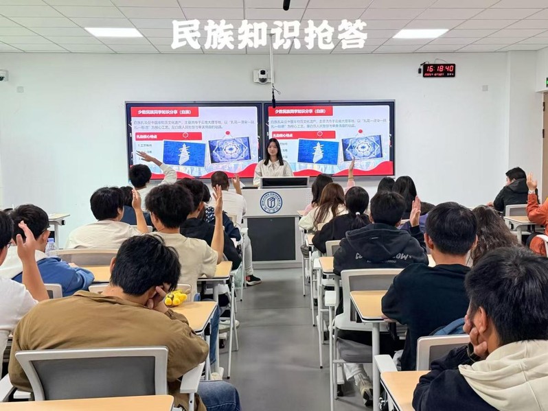 在民族知识问答环节,围绕各民族的历史、地理与文化等内容设置题目,同学们踊跃参与、积极抢答,答对者获赠特色小礼品,现场气氛热烈,大家在互动中加深了对民族知识的理解。